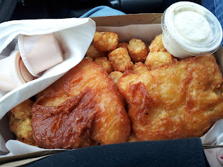 I was less impressed with my meal. Don't get me wrong, the fish tasted fine, the portion was perfectly generous, and the tater tots were serviceable although nothing special. My issue was with whatever oil it is that they're cooking the fish in. It's not the kind that just leaves your fingers slick and greasy, but the type that cools to a sticky gel that fouls everything you touch. I tried to wipe it off , but only succeeded in coating my finger tips with scraps of the tissue paper-thin napkins provided, which then had to be scraped off. Speaking of this edible petroleum jelly, I decided for the first (and last) time to take advantage of the option to show my Groupon on my smartphone rather than printing it. The cashier got this same gunk on the screen of my phone. It took a damp paper towel to remove it.