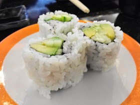 Also, truth be told I prefer the setup at Rotary. The boats at Shige Express are cute and all, but they tend to get bottlenecked, and then there's the whole thing about your food travelling in circles over a river of standing water. This method is clean, convenient, and modern. Rotary does have an actual menu, comprised of standard rolls, noodle dishes, appetizers, rice bowls, and lunch specials as well. I stuck mainly to the sushi train this trip, and I'm going to apologize for the pictures right now. Honestly, I'm sick of trying to wring good ones out of my phone, and I'm basically waiting until I can upgrade next month.
